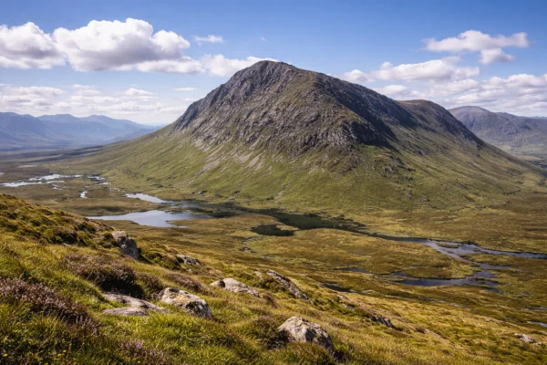 Beinn a’ Chrùlaiste (857 m) is a superb Corbett rising above the junction of Glen Coe and Glen Etive, offering some of the finest viewpoints in the Highlands. Starting from the Kingshouse Hotel, the trail climbs gradually across heather slopes and open moorland, with the vast pyramid of Buachaille Etive Mòr dominating the view.