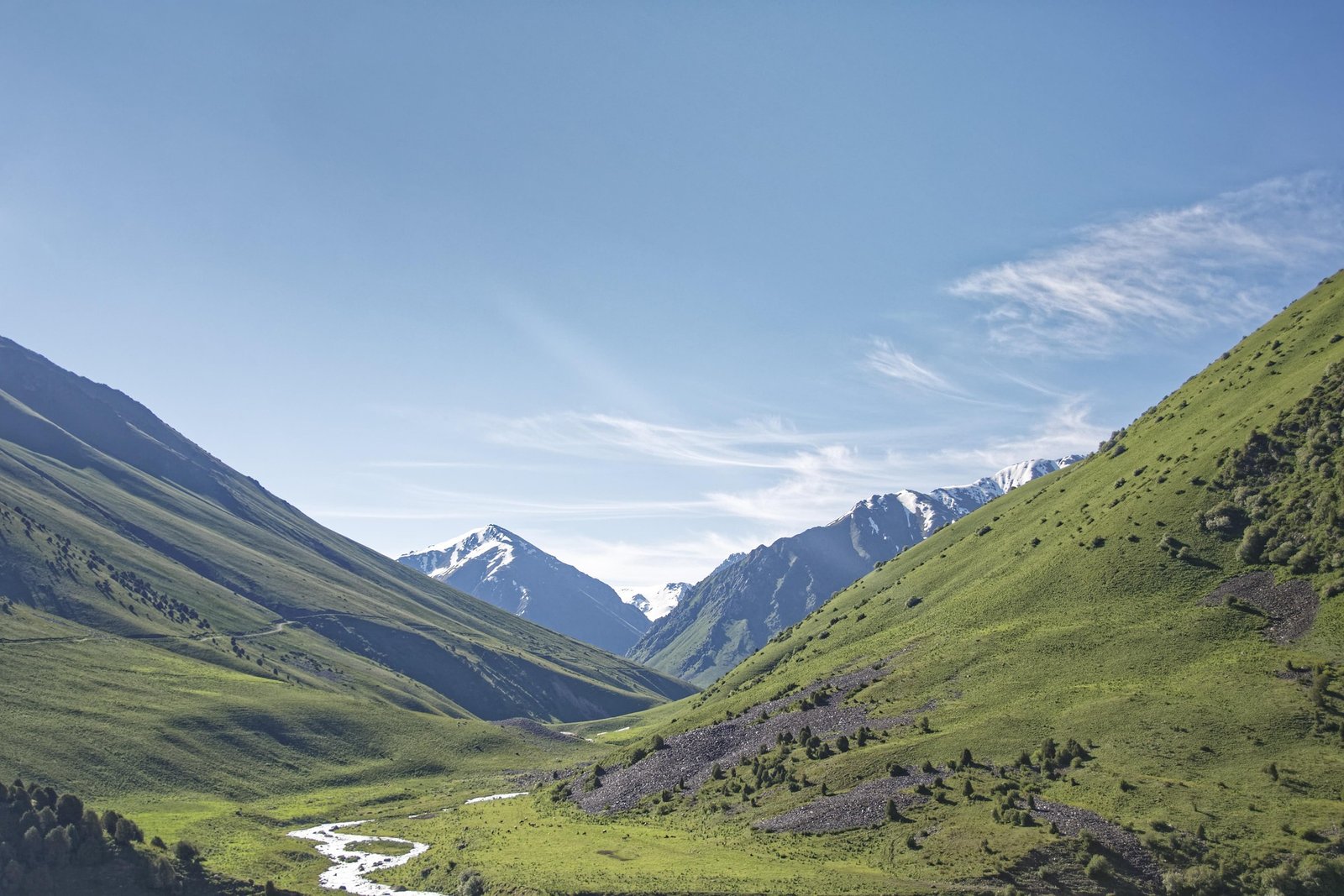 The trail begins in the Karakol Gorge, about 30 minutes from town, following a forested track alongside the river. The early section winds through spruce trees and wooden bridges, passing herders’ huts and small clearings filled with wildflowers. Gradually the path steepens, climbing above the tree line into wide alpine meadows framed by snowy peaks.