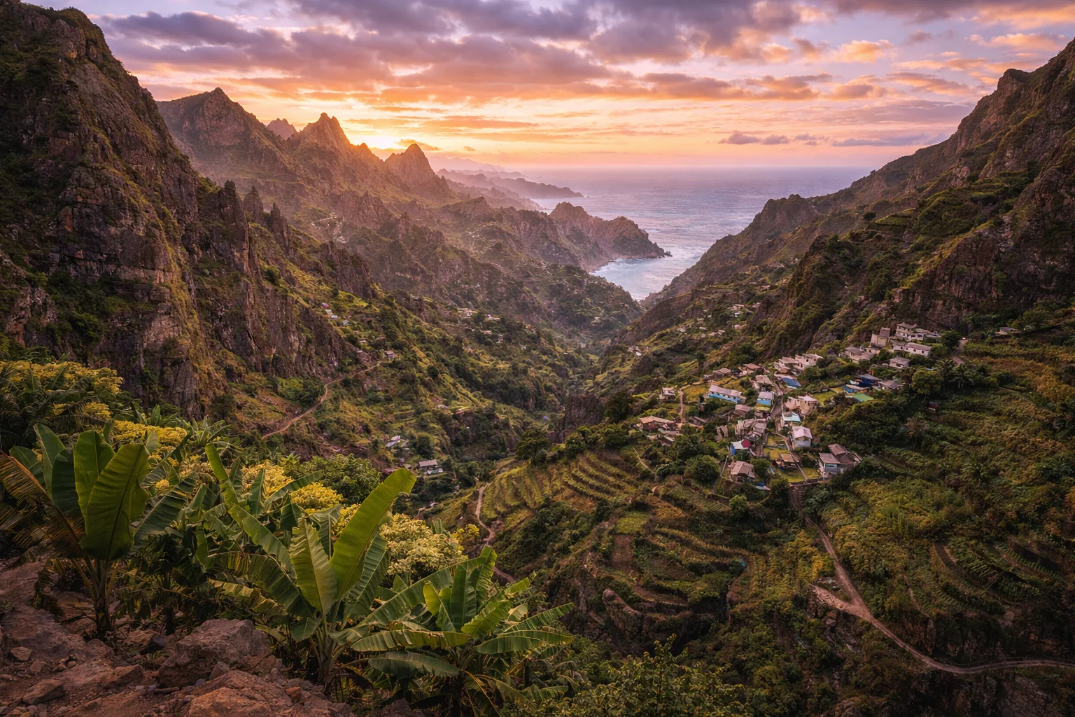 Hiking on Santo Antão in Cape Verde takes you through dramatic volcanic landscapes of deep valleys, towering cliffs, and lush terraced farmland. Trails wind along steep mountain ridges and descend into fertile valleys like Paul Valley, where sugarcane fields, banana plantations, and small villages cling to the slopes. Along the way, sweeping viewpoints reveal the island’s rugged peaks dropping sharply toward the Atlantic. With its striking contrasts of green valleys and dark volcanic rock, hiking on Santo Antão feels adventurous, vibrant, and unforgettable.