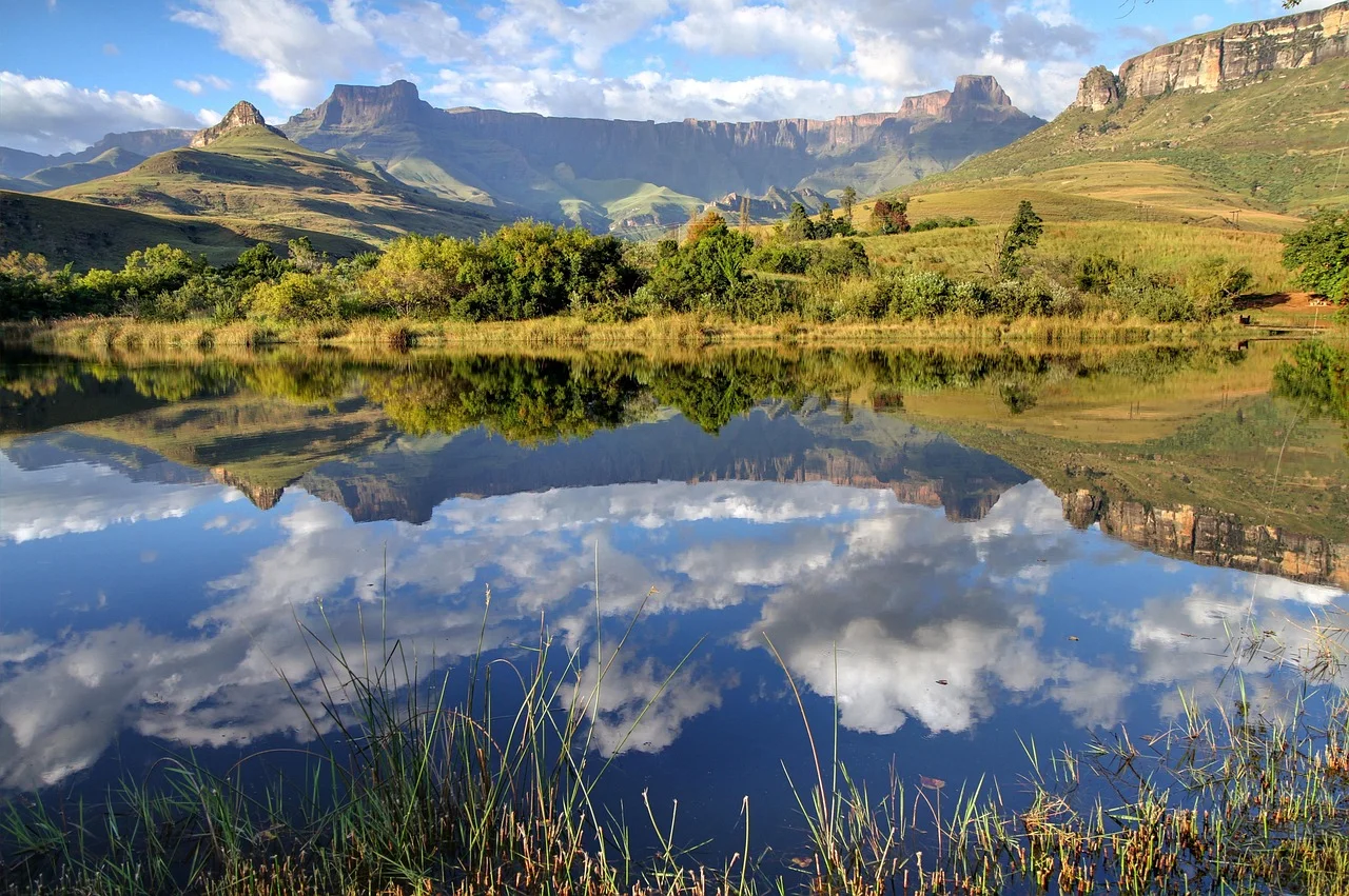 Hiking in the Drakensberg in South Africa takes you through dramatic escarpments, rolling highland grasslands, and towering basalt cliffs. Trails wind through the landscapes of uKhahlamba-Drakensberg Park, where waterfalls plunge from the cliffs and wide valleys stretch beneath the mountains. Along the way you pass clear mountain streams, sweeping plateaus, and viewpoints that look out across the vast interior of southern Africa. With its striking rock walls, open skies, and powerful sense of scale, hiking in the Drakensberg feels wild, expansive, and unforgettable.